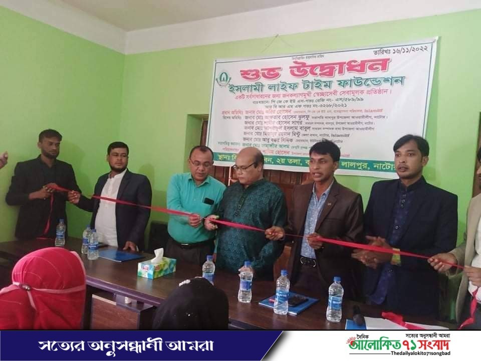 অদ্য:বুধবার (১৬ নভেম্বর) সকালে লালপুর উপজেলার বালিতিতা বিসমিল্লাহ বিল্ডিংয়ে ইসলামি লাইফ টাইম ফাউন্ডেশন লালপুর উপজেলা শাখার শুভ উদ্বোধন করা হয়েছে। ইসলামি লাইফ টাইম ফাউন্ডেশনের ডেপুটি প্রকল্প পরিচালক জাহাঙ্গীর আলমের সভাপতিত্বে প্রধান অতিথি হিসেবে উপস্থিত ছিলেন লালপুর উপজেলা আওয়ামী লীগের সভাপতি আফতাব হোসেন ঝুলফু, সাধারণ সম্পাদক শামীম আহমেদ সাগর, বাঘা উপজেলা আওয়ামী লীগের সাধারণ সম্পাদক আশরাফুল ইসলাম বাবুল,ফাউন্ডেশনের নাটোর জেলা প্রধান মিজানুর রহমান মিন্টু, ফাউন্ডেশনের কর্মকর্তা কর্মচারী ও ফাউন্ডেশনের সহযোগি সদস্যবৃন্দ। এ সময় ফাউন্ডেশনের ১০৭জন সদস্যকে ২২০টাকা করে ভর্তি রেজিষ্ট্রেশন করা হয় এবং প্রত্যেক সদস্যদের মাঝে আলু ৩ কেজি, মসুর ডাল ৫০০গ্রাম,লবণ ৫০০গ্রাম, আটা ১কেজি, ১টি করে হাতধোয়া সাবান বিতরণ করা হয়।