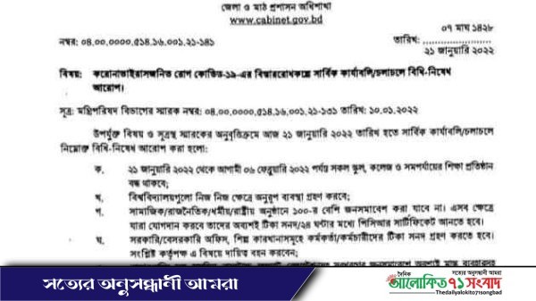 আসন্ন করোনা মহামারী প্রকোপ বেড়ে যাওয়ায় আজ ২১ জানুয়ারি থেকে ৬ই ফেব্রুয়ারী পর্যন্ত বন্ধ থাকবে দেশের সকল স্কুল, কলেজ এবং সমমানের শিক্ষাপ্রতিষ্ঠান।