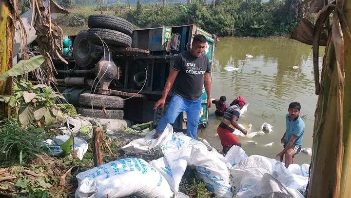 কুষ্টিয়া সদর উপজেলার আলামপুরে একটি সার বোঝাই ট্রাক নিয়ন্ত্রণ হারিয়ে খালে পড়ে ৪০০ বস্তা ইউরিয়া সার নষ্ট হয়েছে।