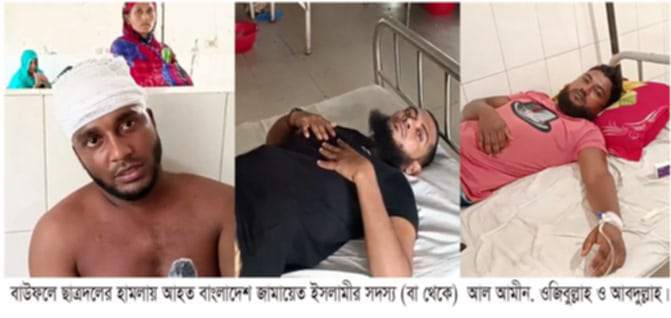 পটুয়াখালীর বাউফল উপজেলায় বাংলাদেশ জামায়াতে ইসলামী’র দুই সদস্য ও এক সমর্থককে পিটিয়ে গুরুতর আহত করা হয়েছে। ওই সময় এক সদস্যের মাথার পাগড়ী ও মুখের দাড়ি ছিড়ে নিয়েছে হামলাকারীরা। গত শনিবার (১৯ অক্টোবর) বেলা ১১ টার সময় উপজেলার কনকদিয়া ইউনিয়নের আমীরাবাদ বাজারে এ হামলার ঘটনাটি ঘটে।আহত সূত্র জানায়, গত শুক্রবার পবিত্র জুম্মায় মাওলানা মনিরুজ্জামান ওজিবুল্লাহ বাংলাদশ জামায়তে ইসলামী একটি ইসলামিক দল এবং তার গুরুত্ব নিয়ে নারায়নপাশা জামে মসজিদে আলোচনা করেন।
