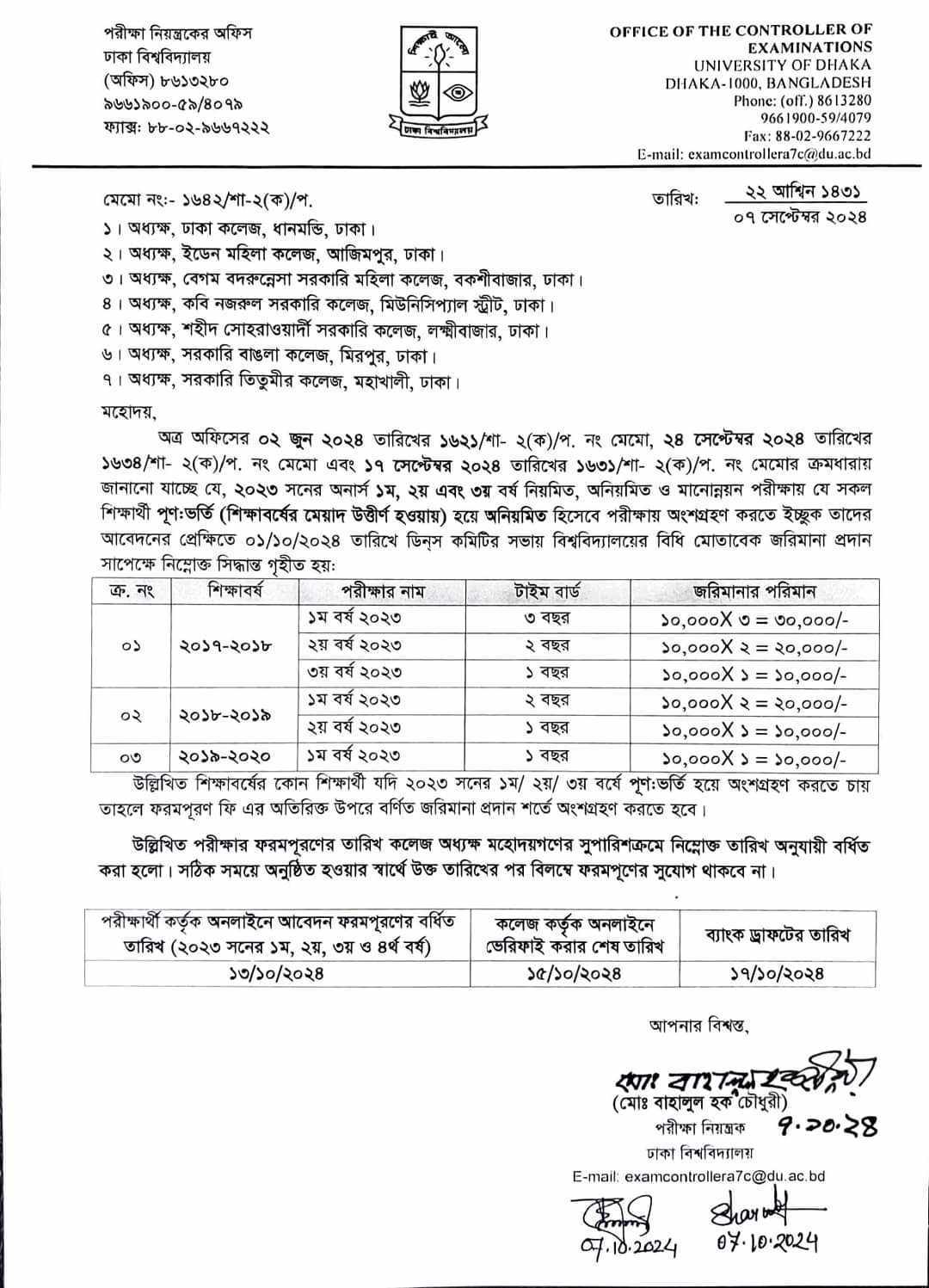 শিক্ষাবর্ষ মেয়াদ উত্তীর্ণ শিক্ষার্থীদের জরিমানা দিয়ে পরীক্ষায় অনিয়মিত অংশগ্রহণে ৫ হাজার টাকা থেকে হুট করে জরিমানার হার ১০ হাজার টাকা করে নিলো ঢাকা বিশ্ববিদ্যালয়। সাথে প্রতি বছরে ১ গুণ হারে বৃদ্ধি। সেই সাথে ফরম পূরণ এর ফি টাকা + পুন:ভর্তি ফি, সেশন ফি টাকাও দিতে হবে।