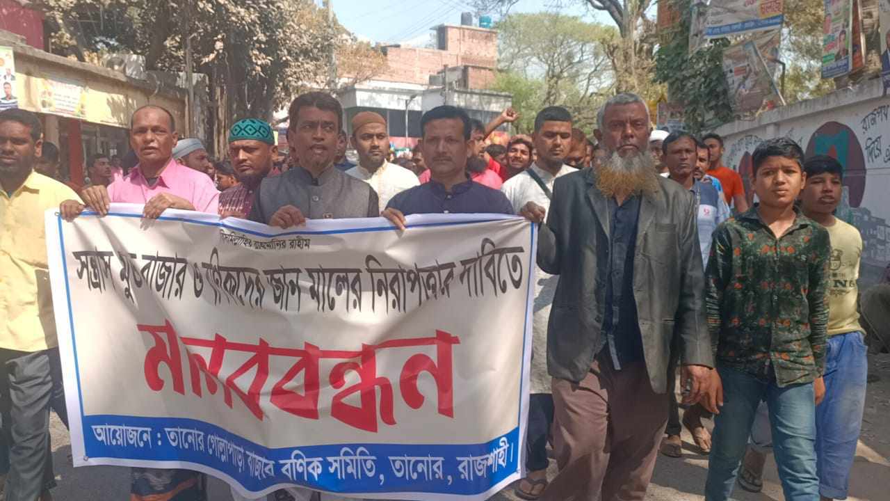 সন্ত্রাস মুক্ত বাজার ও জান মালের নিরাপত্তার দাবিতে তানোরে মানববন্ধন ও বিক্ষোভ মিছিল অনুষ্ঠিত হয়। তানোর বাজার বণিক সমিতির আয়োজনে বৃহস্পতিবার সকালে তানোর গোল্লাপাড়া বাজারে সকল বণিক সদস্যবৃন্দ তাদের দোকান বন্ধ রেখে মানববন্ধন ও মিছিলে অংশগ্রহণ করেন। সন্ত্রাস ও চাঁদাবাজির বিরুদ্ধে স্লোগান দিয়ে মিছিলটি উপজেলা নির্বাহী অফিসারের কার্যালয় সামনে বিক্ষোভ প্রদর্শন করেন। পরে প্রধান প্রধান সড়ক প্রদক্ষিণ শেষে তানোর গোল্লাপাড়া বাজারে মানববন্ধন অনুষ্ঠিত হয়।