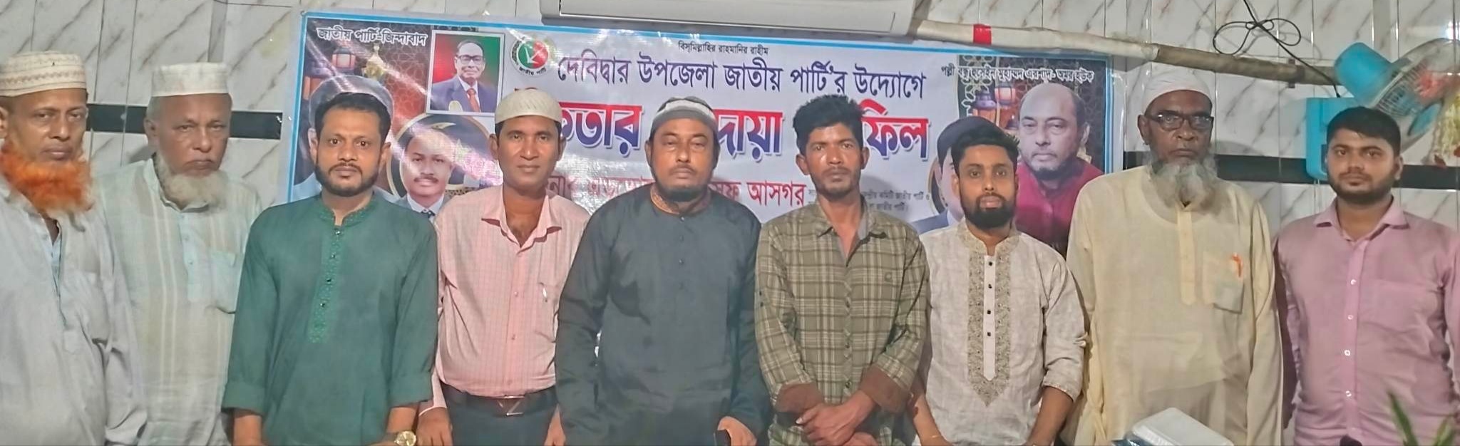 ইফতার ও দোয়া মাহফিলে আবুল কালাম আজাদের সঞ্চালনায় ইঞ্জিনিয়ার আবুল ওয়াহেদের সভাপতিত্বে সভায় প্রধান অতিথি হিসেবে উপস্থিত ছিলেন সাংগঠনিক সম্পাদক কেন্দ্রীয় কমিটি জাতীয় পার্টি ও সভাপতি দেবীদ্বার উপজেলা জাতীয় পার্টি এডভোকেট ইউসুফ আজগর,মুরাদনগর উপজেলা সাবেক এমপি প্রার্থী মোছাম্মদ নাজমা বেগম, বিশেষ অতিথি হিসেবে উপস্থিত ছিলেন দেবীদ্বার উপজেলা জাতীয় পার্টির সাধারণ সম্পাদক মো গোলাম মোস্তফা,কুমিল্লা উত্তর জেলা জাতীয় পার্টি যুগ্ম সাধারণ সম্পাদক মো মফিজুল ইসলাম মাস্টার,আবুল কাশেম মেম্বার জাতীয় পার্টি’র জাফরগঞ্জ ইউনিয়ন সভাপতি,