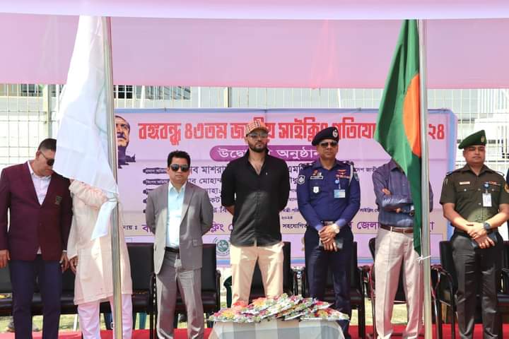 আজ ০৮ মার্চ/২০২৪ (শুক্রবার) নড়াইলে বীরশ্রেষ্ঠ নূর মোহাম্মদ স্টেডিয়াম মাঠে বাংলাদেশ সাইক্লিং ফেডারেশনের ব্যবস্থাপনায় ও নড়াইল জেলা ক্রীড়া সংস্থার সহযোগিতায় (৮-১০ মার্চ) ০৩ দিন ব্যাপী বঙ্গবন্ধু ৪৩ তম জাতীয় সাইক্লিং প্রতিযোগিতা-২০২৪ এর শুভ উদ্বোধন করা হয়। উদ্বোধনী অনুষ্ঠানে প্রধান অতিথি হিসেবে উপস্থিত ছিলেন মাশরাফি বিন মোর্ত্তুজা এমপি, মাননীয় হুইপ, বাংলাদেশ জাতীয় সংসদ । বিশেষ অতিথি হিসেবে উপস্থিত ছিলেন নড়াইল জেলা পুলিশের সুযোগ্য পুলিশ সুপার মোহা.মেহেদী হাসান। পুলিশ সুপার নড়াইল জেলার বিভিন্ন প্রত্যন্ত এলাকা হতে আগত অংশগ্রহণকারীদের শুভকামনা জানান। ভবিষ্যতেও এ ধরনের প্রতিযোগিতা আয়োজনের প্রয়োজনীয়তা তিনি ব্যক্ত করেন। উদ্বোধনী অনুষ্ঠানের প্রাক্কালে সকাল ৭.০০ ঘটিকার সময় নারী ও পুরুষ রেসারদের পৃথক পৃথকভাবে প্রতিযোগিতা অনুষ্ঠিত হয়। পুলিশ সুপার প্রতিযোগীদের রেস উপভোগ করেন। এ সময় মোহাম্মদ আশফাকুল হক চৌধুরী, জেলা প্রশাসক, নড়াইল; অ্যাডভোকেট সুভাস চন্দ্র বোস, চেয়ারম্যান, জেলা পরিষদ, নড়াইল; কবির বিন আনোয়ার, সাবেক মন্ত্রী পরিষদ সচিব ও সভাপতি, বাংলাদেশ সাইক্লিং ফেডারেশন উপস্থিত ছিলেন।