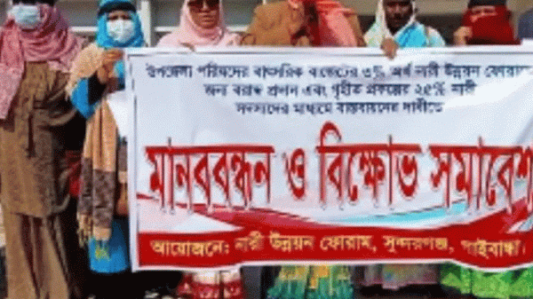 ১৪ই ফেব্রুয়ারী, রোজ সোমবার, সুন্দরগঞ্জ গাইবান্ধা। বাংলাদেশ নারী উন্নয়ন ফোরাম সুন্দরগঞ্জ উপজেলা শাখার আহবানে আজ সুন্দরগঞ্জ উপজেলা পরিষদ চত্বরে “উপজেলা পরিষদের বাৎসরিক বাজেটের ৩% অর্থ নারী উন্নয়ন ফোরামের জন্য বরাদ্দ প্রদান এবং গৃহীত প্রকল্পের ২৫% নারী সদস্যদের মাধ্যমে বাস্তবায়নের দাবীতে, নারী উন্নয়ন ফোরামের গাইবান্ধা জেলা সভাপতি ও সুন্দরগঞ্জ উপজেলা পরিষদের মহিলা ভাইস চেয়ারম্যান মোছাঃ উম্মে সালমা বেগম এর সভাপতিত্বে ” মানববন্ধন ও বিক্ষোভ সমাবেশ” অনুষ্ঠিত হয়।