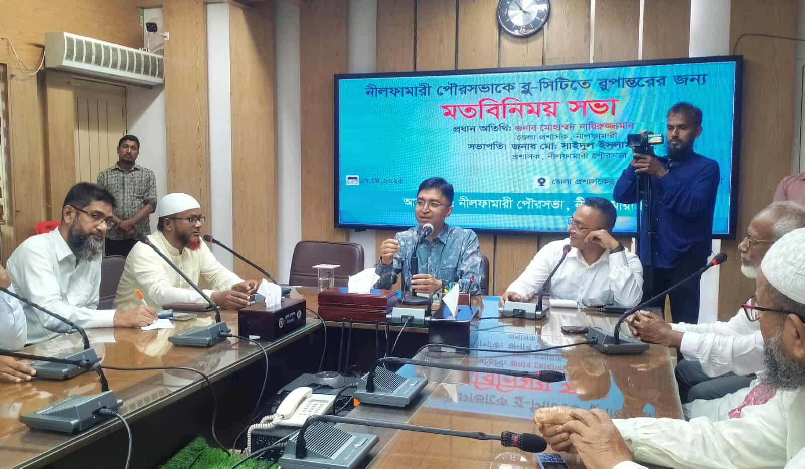 নীলফামারী পৌরসভাকে নীল রঙে সজ্জিত করা হবে বলে জানিয়েছেন জেলা প্রশাসক (ডিসি) মোহাম্মদ নায়িরুজ্জামান। মঙ্গলবার (২৭ মে) বিকেলে জেলা প্রশাসকের সম্মেলন কক্ষে নীলফামারী পৌরসভাকে ব্লু-সিটিতে রুপান্তর করার জন্য আয়োজিত এক মতবিনিময় সভায় প্রধান অতিথির বক্তব্যে তিনি এসব কথা বলেন। তিনি বলেন,“নীলফামারী পৌরসভাকে একটি পরিচ্ছন্ন, আধুনিক ও নান্দনিক শহরে রূপান্তরের লক্ষ্যে আমরা ব্লু-সিটি বাস্তবায়নের উদ্যোগ গ্রহণ করেছি। শহরের প্রতিটি সড়কের পার্শ্বের দেয়াল ও স্থাপনাকে নীল রঙে সাজানো হবে, যাতে করে শহরের নিজস্ব পরিচিতি গড়ে ওঠে। শুধু রঙ নয়, শহরের সৌন্দর্য বৃদ্ধির জন্য বৃক্ষরোপণসহ নানা পরিবেশবান্ধব উদ্যোগ গ্রহণ করা হবে। এই কার্যক্রমে সবার সহযোগিতা কামনা করছি।”