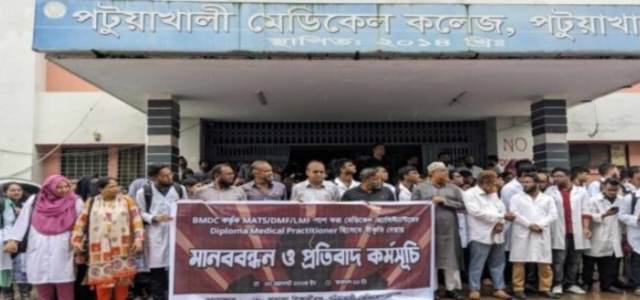 বাংলাদেশ মেডিকেল এ্যাসোসিয়েশন (বিএমএ) কর্তৃক এল,এম,এফ, ডি,এম,এফ ও ম্যাটস ৬ মাসের ট্রেনিং করে ডাক্তার পদবি ব্যাবহারের প্রতিবাদে এবং তাদের রেজিষ্ট্রেশন বাতিলের দাবিতে মানববন্ধন ও প্রতিবাদ কর্মসূচি পালন করেছে পটুয়াখালী মেডিকেল কলেজের শিক্ষক ও শিক্ষার্থীরা।