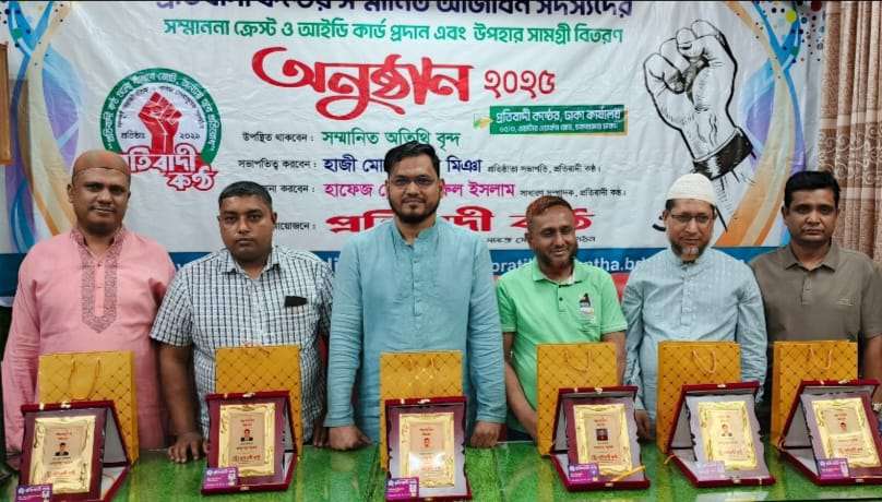 প্রতিবাদী কন্ঠ গুলো বাঁধবে জোট, অন্যায় হবে প্রতিরোধ। এই স্লোগানকে সামনে রেখে এগিয়ে চলছে সম্পূর্ণ অরাজনৈতিক মানবিক ও সামাজিক প্রতিষ্ঠান প্রতিবাদী কন্ঠ। সদস্যদেরকে মানবিক কাজে উৎসাহিত করতে বৃহস্পতিবার রাত আটটা থেকে দ্বিতীয় ধাপে সংগঠনের ঢাকা চকবাজার ওয়াটার ওয়ার্কস ৬৫/৩ কেন্দ্রীয় কার্যালয়ে এ অনুষ্ঠানের আয়োজন করা হয়। অনুষ্ঠানে সংগঠনের প্রতিষ্ঠাতা সভাপতি হাজী মোঃ আজিম মিয়ার সভাপতিত্বে ও সাধারণ সম্পাদক জহিরুল ইসলামের পরিচালনায় অতিথি হিসেবে উপস্থিত ছিলেন ২৯ নং ওয়ার্ড সাবেক কাউন্সিলর হাজী শহিদুল ইসলাম বাবুল। এই সময় ২১জন সম্মানিত আজীবন সদস্যদের মাঝে সম্মাননা ক্রেস্ট আইডি কার্ড ও উপহার সামগ্রী বিতরণ করা হয়।