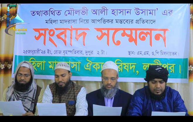 যা মহিলা মাদ্রাসা ও দ্বীনি শিক্ষা ধ্বংসের ষড়যন্ত্র মাত্র।দ্বীনি শিক্ষা ও প্রতিষ্ঠান ধ্বংসে যুগে যুগে এরুপ ইসলামি লেফাজে বহু ব্যক্তিই এমন ষড়যন্ত্রে লিপ্ত হয়েছিল। কিন্তু তারা সফল হয় নি বরং ধ্বংস হয়েছে। বক্তাগন আরো বলেন,আগামী ৪৮ ঘন্টার মধ্যে আলী হাসান ওসামা তওবা করে তার এমন কুরুচিপূর্ন বক্তব্য প্রত্যাহার না করলে দেশব্যাপী ওলামা সাহেবগন কঠোর আন্দোলন সহ প্রয়োজনীয় আইনগত ব্যবস্থা নিতে বাধ্য হবে।