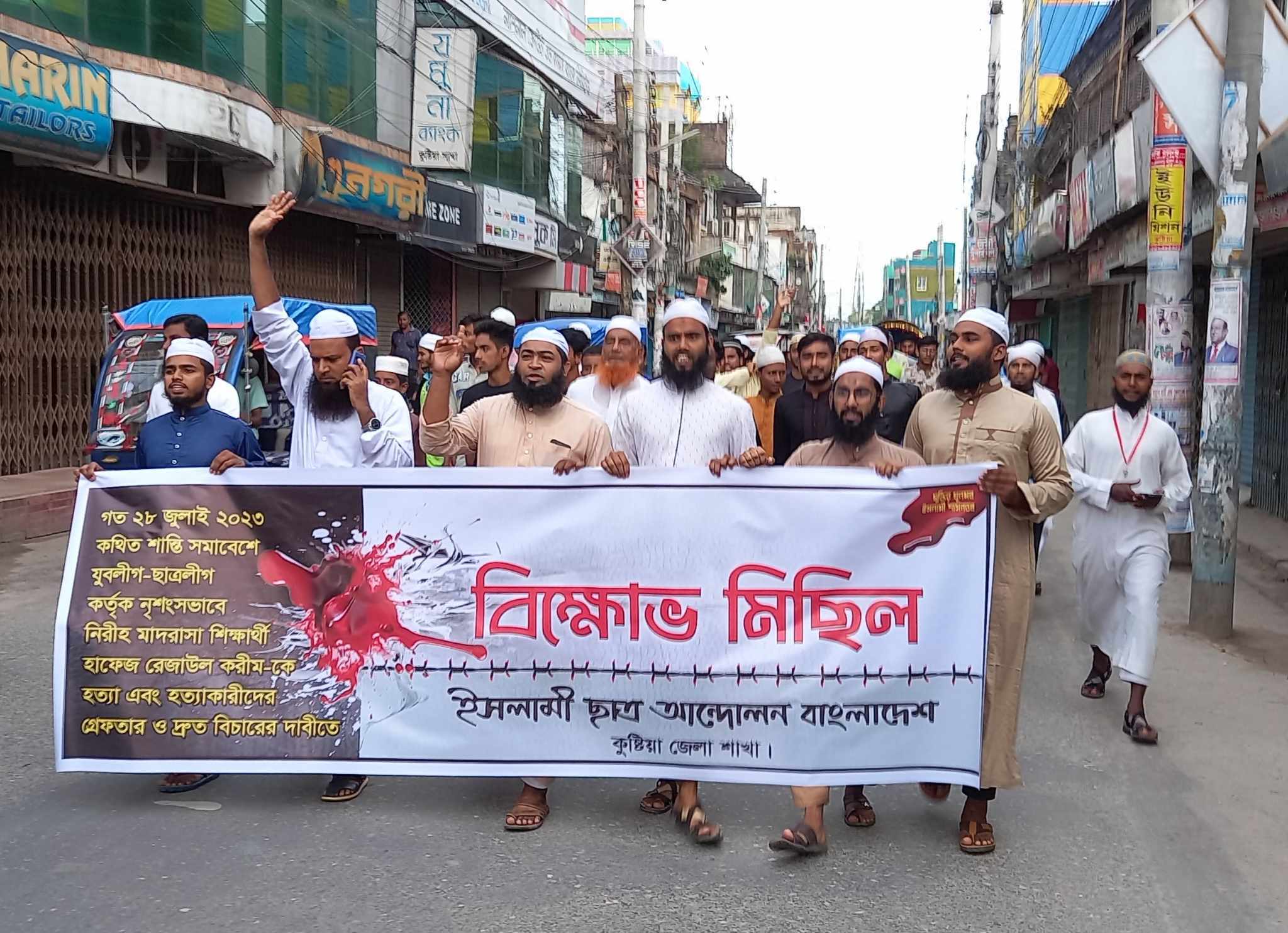 যা গত ২৮ শে জুলাই আওয়ামী যুবলীগ ও ছাত্রলীগ কর্তৃক শান্তি সমাবেশে নৃশংসভাবে মাদ্রাসার মেধাবী ছাত্র রেজাউল করিম হত্যা করা হয়।এই সরকার তার ক্ষমতার প্রধান হাতিয়ার হিসেবে ব্যবহার করছে পুলিশকে। বক্তারা আরো বলেন অতিদ্রুত হত্যাকারীদের আইনের আওতায় আনে কঠিন শাস্তি দিতে, হবে না হলে এই আন্দোলন আরো ভয়াবহ রুপ ধারন করবে ইনশাআল্লাহ। এ সময় উপস্থিত ছিলেন ইসলামী আন্দোলন বাংলাদেশ কুষ্টিয়া জেলার তথ্য ও গবেষণা সম্পাদক মোঃ ইউনুস আহমদ।