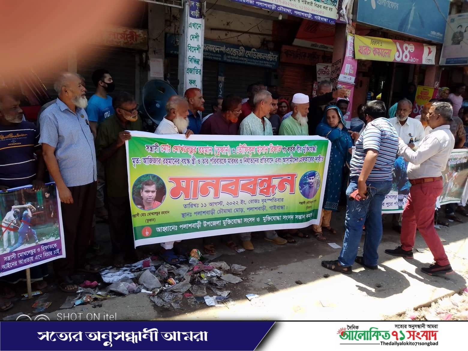 গাইবান্ধা জেলার পলাশবাড়ী পৌর এলাকার বাসিন্দা মরহুম বীর মুক্তিযোদ্ধা আজিজার রহমানের স্ত্রী,ছেলে কন্যা,নাতি নাতনীসহ পরিবারের সদস্যেদের উপর হামালার প্রতিবাদে ও হামলাকারীদের গ্রেফতারের দাবীতে বীরমুক্তিযোদ্ধাগণ ও মুক্তিযোদ্ধার সন্তানদের অংশ গ্রহনে মানববন্ধন অনুষ্ঠিত হয়েছে৷