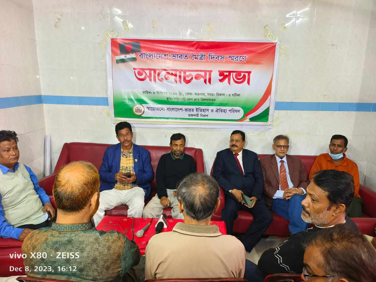 বাংলাদেশর মহান মুক্তি যুদ্ধে প্রতিবেশী ভারত অকৃত্রিম বন্ধু হিসাবে পাশে দাঁড়িয়ে ছিল। ভারতের তৎকালীন প্রধানমন্ত্রী শ্রীমতি ইন্দিরা গান্ধী বাংলাদেশের মুক্তিযুদ্ধে আন্তর্জাতিক সমর্থনা আদায়ে সর্বাত্মক প্রয়াস চালিয়েছেন। তার প্রয়াসের কারণে ৯ মাসের সশস্ত্র যুদ্ধের মধ্য দিয়ে বাঙালিরা বিশ্বের তৎকালীন প্রশিক্ষিত সেনাবাহিনী, পাকিস্তানি সেনাবাহিনীকে পরাস্ত করতে সক্ষম হয়, বাংলাদেশ স্বাধীন হয়।সোভিয়েত নেতা লিওনিদ ব্রেজনেভের নেতৃত্বে তৎকালীন সমাজতান্ত্রিক দেশগুলো বাংলাদেশের পাশে দাঁড়িয়েছিল। আজ শুক্রবার বিকাল ৩ টায় রাজশাহী প্রেসক্লাব মিলনায়তনে বাংলাদেশ-ভারত মৈত্রী দিবস উপলক্ষে এক আলোচনা সভায় বক্তারা এ কথা বলেন। বাংলাদেশ-ভারত ইতিহাস ও ঐতিহ্য পরিষদ রাজশাহী বিভাগ আয়োজিত এই আলোচনা সভায় প্রধান অতিথি ছিলেন বীর মুক্তিযোদ্ধা শাহজাহান আলী বরজাহান।সংগঠনের সভাপতি প্রকৌশলিক শামসুল আলমের সভাপতিত্বে ও সাধারণ সম্পাদক সাইদুর রহমানের পরিচালনায় আলোচনা সভায় অন্যান্যের মধ্যে বক্তব্য রাখেন মুক্তিযুদ্ধের তথ্য সংগ্রাহক ওয়ালিউর রহমান বাবু, আন্তর্জাতিক রবীন্দ্র গবেষণা ইনস্টিটিউটের পরিচালক প্রফেসর ড. মতিউর রহমান , রাজশাহী বিশ্ববিদ্যালয়ের ইতিহাস বিভাগের প্রফেসর ড. গোলাম সারোয়ার, জননেতা আতাউর রহমান স্মৃতি পরিষদের সহ-সভাপতি সালাউদ্দিন মিন্টু, বাংলাদেশ কংগ্রেস পার্টি রাজশাহী মহানগরীর নেতা মোঃ মারুফ শাহারিয়া।বক্তারা বলেন মুক্তিযুদ্ধের শেষ পর্যায়ে ৬ই ডিসেম্বর ভারত বাংলাদেশকে স্বীকৃতি প্রদানের মাধ্যমে বিজয় তরন্বিত করে । যে উদ্দেশ্য নিয়ে আমরা মুক্তিযুদ্ধ করেছিলাম সেই উদ্দেশ্য আজও পূরণ হয়নি। আজও শোষণ নির্যাতন বৈষম্য চলছে। লুটপাটের রাজনীতি আমাদের অর্জনকে হুমকির মধ্যে ফেলে দিচ্ছে। বক্তারা মুক্তিযুদ্ধের চেতনায় উদ্বুদ্ধ হয়ে চলমান লুটপাটের বিরুদ্ধে সর্বাত্মক প্রতিরোধ গড়ে তোলার জন্য জনগণের প্রতি আহ্বান জানান। আলোচনা সভার শুরুতে মহান মুক্তিযুদ্ধের শহীদদের স্মৃতির প্রতি শ্রদ্ধা নিবেদন করে দাঁড়িয়ে ১ মিনিট নীরবতা পালন করা হয়। আলোচনা সভায় জননেতা আতাউর রহমান স্মৃতি পরিষদের রাতুল সরকার, ইউসুফ আলী , সাগর নোমানী , সাজিদুল হক টিটু হিউম্যান রাইটস্ জানালিষ্ট ইউনিয়ন সভাপতি কাজি আসাদুর রহমান টিটু, সহ-সভাপতি আরিফুল ইসলাম, সহ-মহিলা বিষয় সম্পাদক উম্মে নাজনীন সহ রাজশাহী মহানগরীর বিভিন্ন ওয়ার্ডের শতাধিক নেতাকর্মী উপস্থিত ছিলেন।