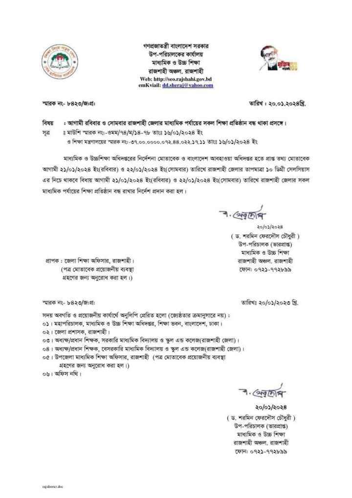 শনিবার মাধ্যমিক ও উচ্চ মাধ্যমিক শিক্ষার (মাউশি) রাজশাহী অঞ্চলের উপপরিচালক ড. শরমিন ফেরদৌস চৌধুরী স্বাক্ষরিত এক অফিস আদেশে বলা হয়েছে, আবহাওয়া অধিদপ্তরের পূর্বাভাস অনুযায়ী রোববার ও সোমবার রাজশাহীর তাপমাত্রা ১০ ডিগ্রি সেলসিয়াসের নিচে থাকবে। তাই মাউশির নির্দেশনা অনুযায়ী এ দুই দিন মাধ্যমিক বিদ্যালয়গুলো বন্ধ থাকবে।
