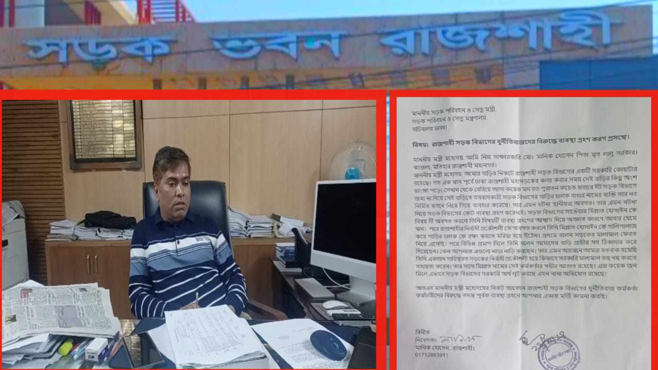 রাজশাহী সড়ক বিভাগের নানা অনিয়ম আর দুর্নীতির কথা উল্লেখ করে আওয়ামী লীগের সাধারণ সম্পাদক সড়ক ও সেতু মন্ত্রীর নিকট লিখিত অভিযোগ দায়ের হয়েছে। গত ২৪ শে মার্চ পৃথকভাবে দুটি অভিযোগ দায়ের হয়েছে সড়ক ও সেতু মন্ত্রীর দপ্তরে। লিখিত সেই অভিযোগে বলা হয়েছে রাজশাহী সড়ক বিভাগের জায়গায় বসবাস করা অবস্থায় সড়কের গাড়ি চালক বাহার উদ্দিন নামের ব্যক্তি সড়কের ইট রড নিজের নবনির্মিত ভবনে নিয়ে গিয়ে ব্যবহার করছেন বিষয়টি রাজশাহী সড়কের নির্বাহী প্রকৌশলী আব্দুল হাকিমকে একাধিকবার অবগত করা হলেও তিনি এই বিষয়ে কোন ব্যবস্থা গ্রহণ করেন নাই।