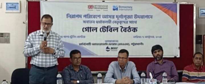 পটুয়াখালী জেলাতে পাশা ট্রেনিং সেন্টারে আয়োজিত হল নিরাপদ পরিবেশে আসন্ন দূর্গাপূজা উদযাপনে সনাতন ধর্মাবলম্বী নেতৃবৃন্দের সাথে গোলটেবিল বৈঠক ও মতবিনিময় সভা অনুষ্ঠিত হয়েছে গত ৭ অক্টোবর ২৪ তারিখ সোমবার, সকালে নিরাপদ পরিবেশে আসন্ন দূর্গাপূজা উদযাপনের ক্ষেত্রে ডেমোক্রেসি ইন্টারন্যাশনাল-এর সহায়তায় এবং ইউকে-এর এফসিডিও-এর অর্থায়নে মাল্টিপার্টি অ্যাডভোকেসি ফোরাম (এমএএফ) এর উদ্যোগে সনাতন ধর্মালম্বী নেতৃবৃন্দের সাথে এক আলোচনা সভার আয়োজন করা হয়।