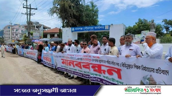 ঢাকা সাভার হাজী ইউনুছ আলী স্কুল এন্ড কলেজের প্রভাষক উৎপল কুমার সরকারকে নির্মমভাবে হত্যা ও নড়াইলে অধ্যক্ষ স্বপন কুমার বিশ্বাসকে গলায় জুতার মালা পড়িয়ে শিক্ষক লাঞ্চিতের প্রতিবাদে লক্ষ্মীপুরের রামগঞ্জ উপজেলা মাধ্যমিক শিক্ষক সমিতির উদ্যোগে মানববন্ধন অনুষ্ঠিত হয়েছে। ২ জুলাই (শনিবার) সকালে রামগঞ্জ পৌরসভার সামনে বাইপাস সড়কে ওই মানববন্ধন অনুষ্ঠিত হয়।