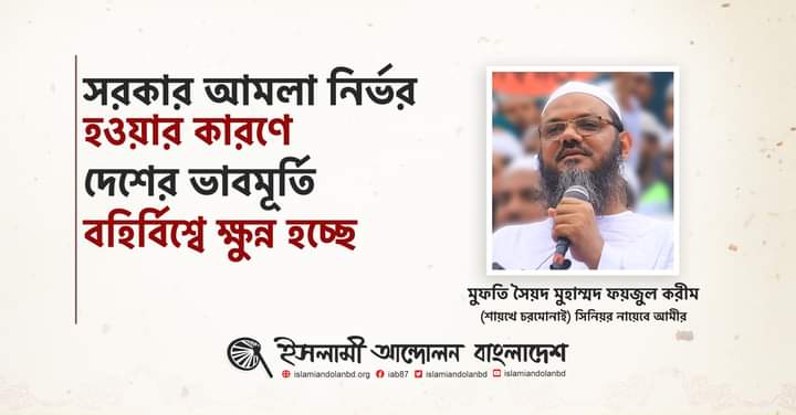 ইসলামী আন্দোলন বাংলাদেশ-এর সিনিয়র নায়েবে আমীর মুফতী সৈয়দ মুহাম্মদ ফয়জুল করীম শায়খে চরমোনাই বলেছেন, সরকার অতিমাত্রায় আমলা নির্ভর হওয়ার কারণে দেশের ভাবমূর্তি বহির্বিশ্বে ক্ষুন্ন হচ্ছে। বিভিন্ন দেশ ভিসানীতির আওতায় নিয়ে আসছে।