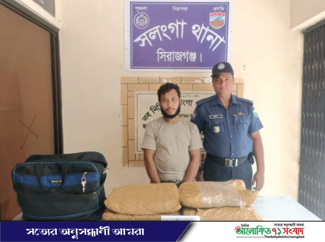 সলঙ্গা থানার অফিসার ইনচার্জ (ওসি) শহিদুল ইসলাম শুক্রবার দুপুরে জানান,ফেনী হতে আহাদ এন্টার প্রাইজ যাত্রীবাহী বাস (ঢাকা মেট্রো-ব-১৩-১৯৭৯) ঠাকুরগাঁও রানীশংকৈল যেতে ছিল। গোপন সংবাদের ভিত্তিতে হাটিকুমরুল গোলচত্ত¡র এলাকার সাখাওয়াত এইচ মেমোরিয়াল হাসপাতালের সামনে অভিযান চালিয়ে ৮ কেজি গাঁজাসহ মাদক ব্যবসায়ী রাজুকে আটক করা হয়। এব্যাপারে সলঙ্গা থানায় মাদকদ্রব্য নিয়ন্ত্রণ আইনে মামলা রুজু করে আসামীকে সিরাজগঞ্জ জেলহাজতে প্রেরন করা হয়েছে।