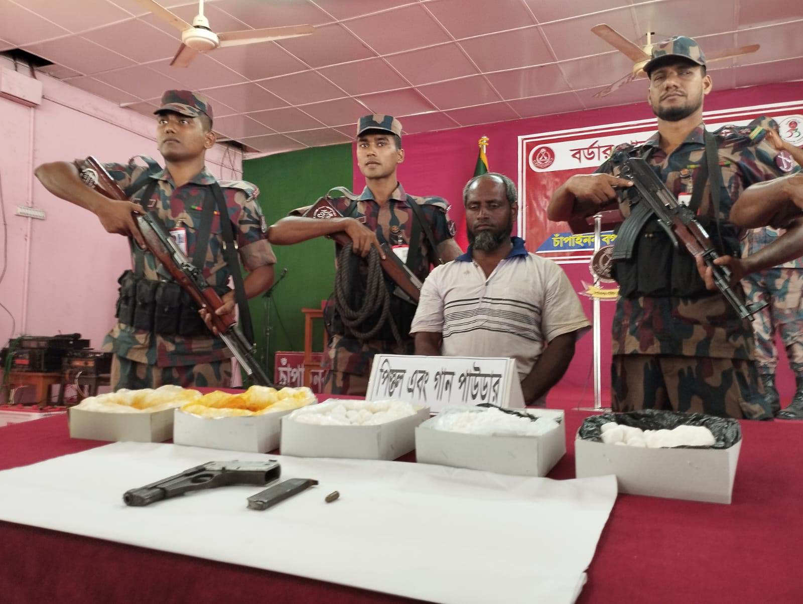 চাঁপাইনবাবগঞ্জের জহুরপুর টেক সীমান্ত এলাকায় অভিযান চালিয়ে ৭ কেজি ৪৫০ গ্রাম গানপাউডার ও আগ্নেয়াস্ত্রসহ মনিরুল ইসলাম নামে একজন শীর্ষ ক্রাইম-মারকে আটক করেছে ৫৩ বিজিবি ব্যাটেলিয়ান। আটক মনিরুল ইসলাম জেলার সদর উপজেলার নারায়নপুর ইউনিয়নের সূর্যনারায়নপুর গ্রামের মৃত সাবদুল হকের ছেলে। দীর্ঘদিন যাবত আইন-শৃঙ্খলা বাহিনীর চোখে ধুলো দিয়ে ভারত থেকে পাচার করত তাদের সক্রিয় বাহিনী দিয়ে।