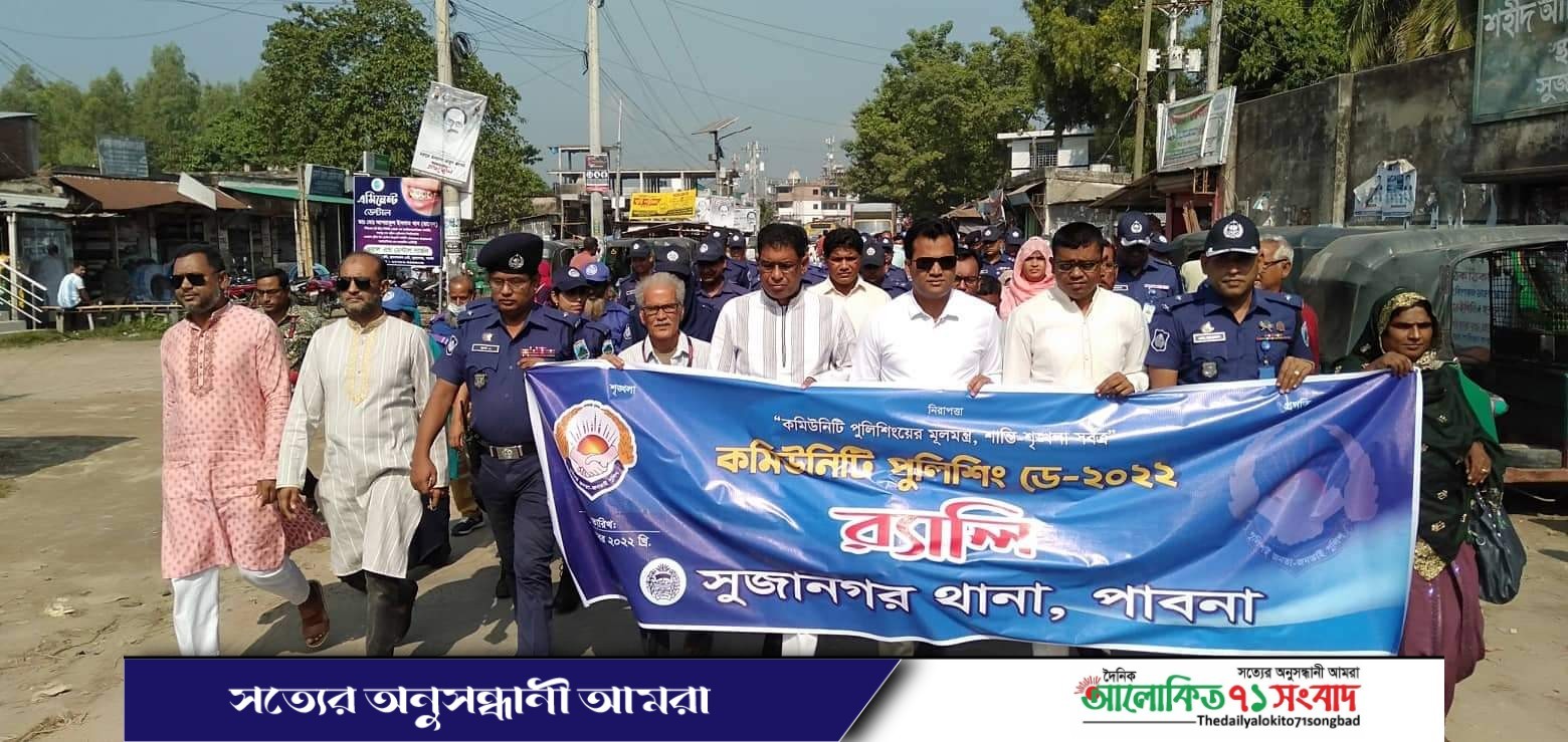 “কমিউনিটি পুলিশিংয়ের মূলমন্ত্র, শান্তি শৃঙ্খলা সর্বত্র” প্রতিপাদ্যকে সামনে রেখে সুজানগর থানার আয়োজনে, কমিউনিটি পুলিশিং ডে উপলক্ষে বর্ণাঢ্য শোভাযাত্রা ও সুধী সমাবেশ অনুষ্ঠিত হয়েছে। শনিবার সকালে পাবনার সুজানগর থানার আয়োজনে, বর্ণাঢ্য শোভাযাত্রা শেষে থানা চত্বরে সুধী সমাবেশ অনুষ্ঠিত হয়।সুধী সমাবেশে প্রধান অতিথির বক্তব্য দেন, উপজেলা চেয়ারম্যান শাহীনুজ্জামান শাহীন। বিশেষ অতিথির বক্তব্য দেন, উপজেলা নির্বাহী কর্মকর্তা তরিকুল ইসলাম, পৌরসভার মেয়র রেজাউল করিম রেজা। থানার ভারপ্রাপ্ত কর্মকর্তা (ওসি) আব্দুল হাননান এর সভাপতিত্বে ও সাব ইন্সপেক্টর তহিদের সঞ্চালনায় আরো বক্তব্য দেন, ইউপি চেয়ারম্যান মশিউর রহমান, সাতবাড়িয়া ডিগ্রী কলেজের অধ্যক্ষ ও কমিউনিটি পুলিশিংয়ের সদস্য সচিব আব্দুল বাছেত বাচ্চু।এ সময় থানার ইন্সপেক্টর তদন্ত মুক্ত রায় চৌধুরী পিপিএম, সুজানগর প্রেসক্লাবের সভাপতি মোহাম্মদ আলী মাষ্টার, সাধারণ সম্পাদক এম মনিরুজ্জামান, মহিলা ডিগ্রী কলেজের সহকারী অধ্যাপক জাহিদুল হাসান রোজ, পৌর আওয়ামী লীগের সভাপতি ফেরদৌস আলম ফিরোজ, বিশিষ্ট ব্যবসায়ী মেহেদী মাসুদ, পৌরসভার কাউন্সিলর আব্দুল্লাহ আল মামুন, মোসফিকুর রহমান সাচ্চু, জাকির হোসেন সহ রাজনৈতিক,সাংবাদিক,গ্রাম পুলিশ ও সুশীল সমাজের নেতৃবৃন্দ উপস্থিত ছিলেন।