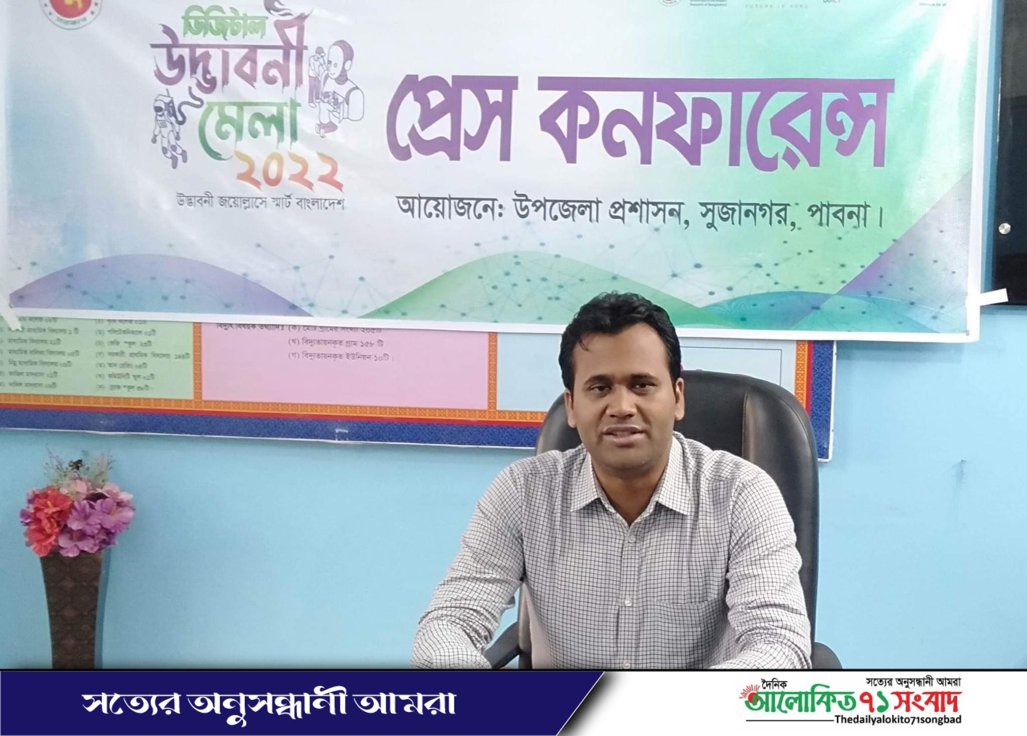 “উদ্ভাবনী জয়োল্লাসে স্মার্ট বাংলাদেশ” প্রতিপাদ্যকে সামনে রেখে উপজেলা প্রশাসনের আয়োজনে, ডিজিটাল উদ্ভাবনী মেলা উপলক্ষে প্রেস কনফারেন্স অনুষ্ঠিত হয়েছে। শনিবার সকালে পাবনার সুজানগরে উপজেলা নির্বাহী কর্মকর্তার কার্যালয়ে প্রেস কনফারেন্স অনুষ্ঠিত হয়।প্রেস কনফারেন্স বক্তব্য দেন, উপজেলা নির্বাহী কর্মকর্তা তরিকুল ইসলাম।এ সময় সুজানগর প্রেসক্লাবের সভাপতি মোহাম্মদ আলী মাষ্টার, সিনিয়র সাংবাদিক ও পল্লী গ্রাম পত্রিকার সম্পাদক আব্দুস শুকুর, দৈনিক প্রতিদিনের বাংলাদেশ প্রতিনিধি শাজাহান আলী, দৈনিক ইত্তেফাক পত্রিকার প্রতিনিধি তৌফিক হাসান, প্রেসক্লাবের সাধারণ সম্পাদক ও দৈনিক যায়যায়দিন পত্রিকার প্রতিনিধি এম মনিরুজ্জামান, দৈনিক যুগান্তর পত্রিকার প্রতিনিধি আব্দুল আলীম রিপন, আক্তারুজ্জামান জর্জ, অনলাইন নিউজ পোর্টাল এম টিভির ব্যবস্থাপনা পরিচালক মঞ্জুর রহমান উপস্থিত ছিলেন। উপজেলা নির্বাহী কর্মকর্তা তরিকুল ইসলাম জানান, ডিজিটাল উদ্ভাবনী মেলায় বিভিন্ন দপ্তরের ২২ টি স্টল করা হয়েছে। এই সকল স্টলের মাধ্যমে সাধারণ মানুষের সুবিধার্থে সেবা প্রদান করা হবে। এরমধ্যে রয়েছে, জন্মনিবন্ধন, কৃষি,স্বাস্থ্য, শিক্ষা, যোগাযোগ ও ভূমি সংক্রান্ত কিংবা জনবান্ধব গুরুত্বপূর্ণ সকল ধরনের পরামর্শ ও সেবা দেওয়া হবে।