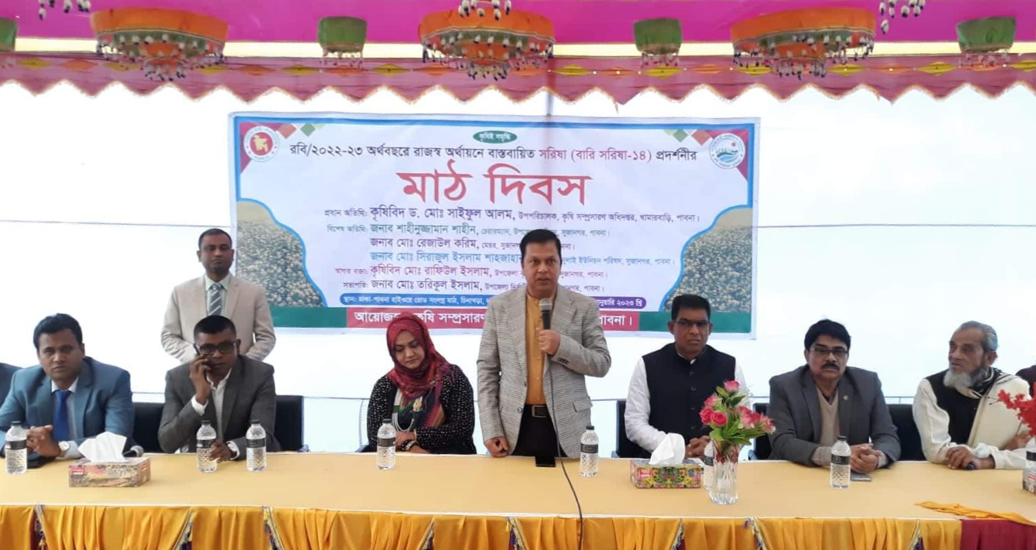 উপজেলা কৃষি সম্প্রসারণ অধিদপ্তরের আয়োজনে,২০২২-২৩ অর্থবছরের রাজস্ব অর্থায়নে বাস্তবায়িত বারি সরিষা -১৪ প্রদর্শনীর মাঠ দিবস অনুষ্ঠিত হয়েছে। সোমবার বিকেলে পাবনার সুজানগর উপজেলার দুলাই ইউনিয়নের চিনাখড়া বাজারের ঢাকা – পাবনা হাইওয়ে সড়ক সংলগ্ন মাঠে বারি সরিষা -১৪ প্রদর্শনী উপলক্ষে মাঠ দিবস অনুষ্ঠিত হয়।