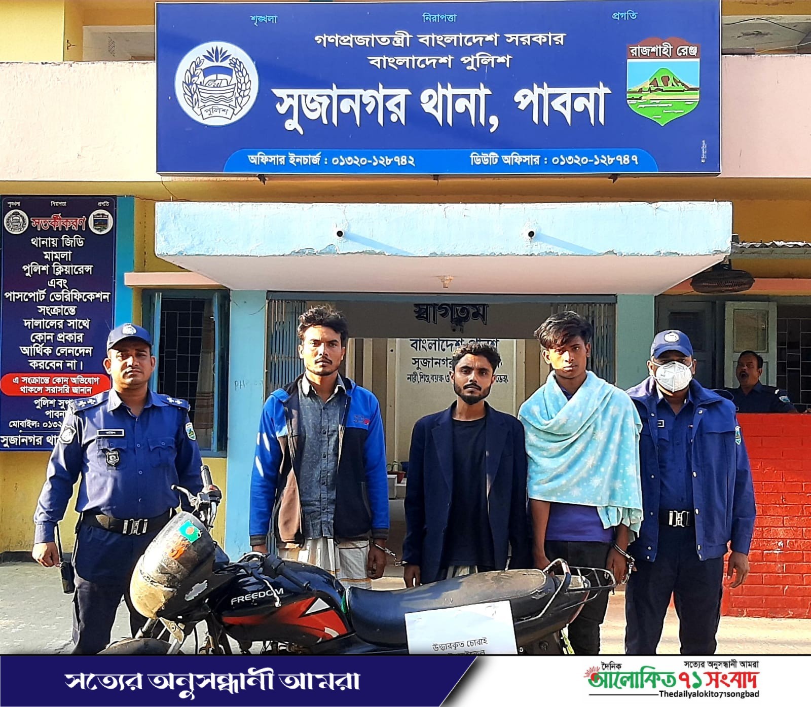মাননীয় পুলিশ সুপার জনাব মোঃ আকবর আলী মুন্সী মহোদয়ের নির্দেশনায় সুজানগর থানাকে মাদক ও সকল প্রকার অপরাধ মুক্ত করার লক্ষ্যে সুজানগর থানার একটি অভিযানিক দল কর্তৃক ২৬/১১/২০২২ তারিখ পাবনা জেলার আমিনপুর ও বেড়া থানা এলাকায় অভিযান চালিয়ে তিনজন সংঘবদ্ধ মোটরসাইকেল চোরকে চুরি যাওয়া মোটরসাইকেল সহ আটক করা হয়েছে। উল্লেখ যে, চোররা সুজানগর থানার সাতবাড়ীয়া বাজার হইতে গত ইং ২৫/১১/২০২২ তারিখ জুম্মার নামাজের সময় মোটরসাইকেলটি চুরি করে পাবনা জেলার বেড়া থানাধীন বাকসোয়া গ্রামে নিয়ে যায়। তথ্য প্রযুক্তির মাধ্যমে উক্ত মটরসাইকেল টি বেড়া থানাধীন বাগসোহা গ্রাম হইতে উদ্ধার করা হয়। তাদের সকলের বিরুদ্ধে আইনগত ব্যবস্থা গ্রহণ করে পাবনা আদালতের মাধ্যমে কারাগারে প্রেরণ করা হয়েছে।