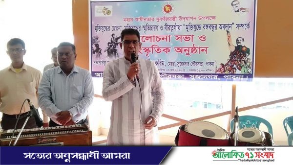 সুজানগর পৌরসভার আয়োজনে, মহান স্বাধীনতার সুবর্ণজয়ন্তী উদযাপন উপলক্ষে মুক্তিযুদ্ধের চেতনা, মুক্তিযুদ্ধের স্মৃতিচারণ ও বীরত্বগাঁথা “মুক্তিযুদ্ধে বঙ্গবন্ধুর অবদান” সম্পর্কে আলোচনা সভা ও সাংস্কৃতিক অনুষ্ঠান অনুষ্ঠিত হয়েছে। বৃহস্পতিবার বিকেলে পাবনার সুজানগর পৌরসভা চত্বরে মহান স্বাধীনতার সুবর্ণজয়ন্তী উদযাপন উপলক্ষে মুক্তিযুদ্ধের চেতনা, মুক্তিযুদ্ধের স্মৃতিচারণ ও বীরত্বগাঁথা “মুক্তিযুদ্ধে বঙ্গবন্ধুর অবদান” সম্পর্কে আলোচনা সভা ও সাংস্কৃতিক অনুষ্ঠান অনুষ্ঠিত হয়। পৌরসভার মেয়র ও উপজেলা আওয়ামী লীগের সাংগঠনিক সম্পাদক রেজাউল করিম রেজা’র সভাপতিত্বে ও সচিব গোলাম নবীর সঞ্চালনায় আলোচনা সভায় বক্তব্য দেন, বীরমুক্তিযোদ্ধা আব্দুল হাই, নিজাম উদ্দিন আজগর আলী ডিগ্রী কলেজের প্রফেসর আবুল হাশেম, উপজেলা আওয়ামী লীগের কৃষি বিষয়ক সম্পাদক রাজা হাসান, পৌর আওয়ামী লীগের সভাপতি ফেরদৌস আলম ফিরোজ প্রমুখ।এ সময় পৌরসভার কাউন্সিলর ও কর্মকর্তা বৃন্দ উপস্থিত ছিলেন। সাংস্কৃতিক অনুষ্ঠানে গান পরিবেশন করেন, কণ্ঠশিল্পী অধ্যক্ষ আব্দুল বাছেত বাচ্চু, সমর শর্মা, তৃষ্ণা ও দেলোয়ার।