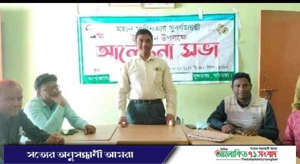 মহান স্বাধীনতার সুর্বণ জয়ন্তী উপলক্ষে গাইবান্ধার সুন্দরগঞ্জ পৌর কার্যালয় ৩ দিন ব্যাপি আলোচনা সভার অনুষ্ঠিত হয়েছে। গতকাল বৃহস্পতিবার সকালে পৌর কার্যালয়ে পৌর মেয়র আব্দুর রশিদ সরকার ডাবলু’র সভাপতিত্বে ৩ দিন ব্যাপি আলোচনা সভা অনুষ্ঠিত হয়। সমাপনী অনুষ্ঠানে বক্তব্য রাখেন, পৌর সভার প্যানেল মেয়র ছামিউল ইসলাম, সংরক্ষিত মহিলা কাউন্সিলর রুবিয়া বেগম, রত্না রানী, মনোয়ারা বেগম, কাউন্সিলর মাজেদুর রহমান প্রামানিক রুনু, জামিউল ইসলাম, মাহবুবুর রহমান, মশিউর রহমান বিপ্লব, লাবলু মিয়া, শাহীন মিয়া, হাবিবুর রহমান, দীপক কুমার সরকার প্রমূখ।
