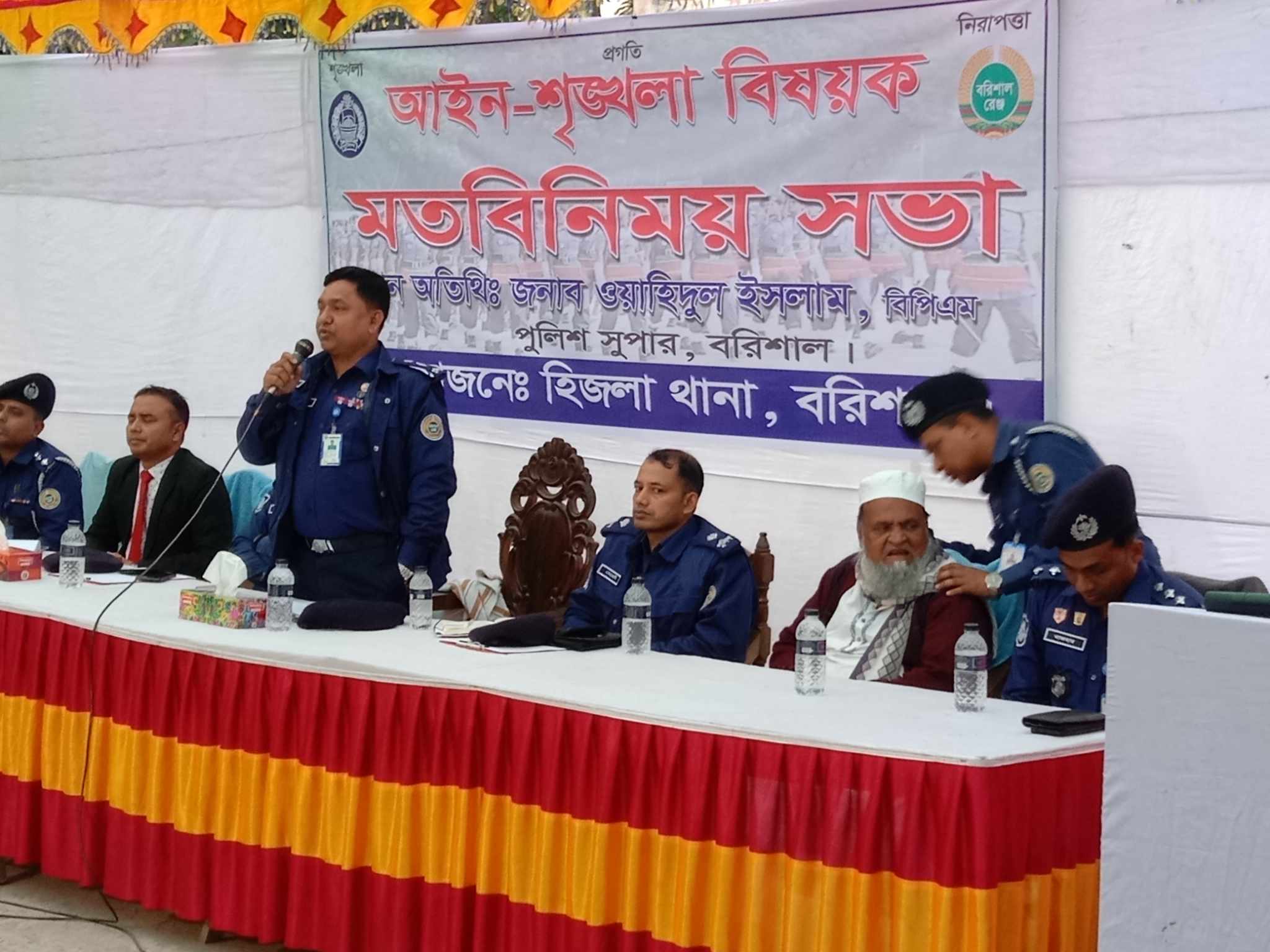 বরিশালের হিজলা থানা কমপ্লেক্স মাঠে আইনশৃঙ্গলা বিষয়ক মতবিনিময় সভা অনুষ্টিত হয়েছে। মঙ্গলবার বেলা সাড়ে ৩ টার সময় হিজলা থানার আয়োজনে মতবিনিময় সভা হয়।সভায় প্রধান অতিথির বক্তব্য দেন বরিশাল জেলা পুলিশ সুপার ওয়াহিদুল ইসলাম(বিপিএম)।তিনি বলেন নির্বাচনী পরবর্তিতে হিজলা উপজেলায় রাজনৈতিক সহিংসতায় আইনশৃঙ্গলা চরম অবনতি হচ্ছে।